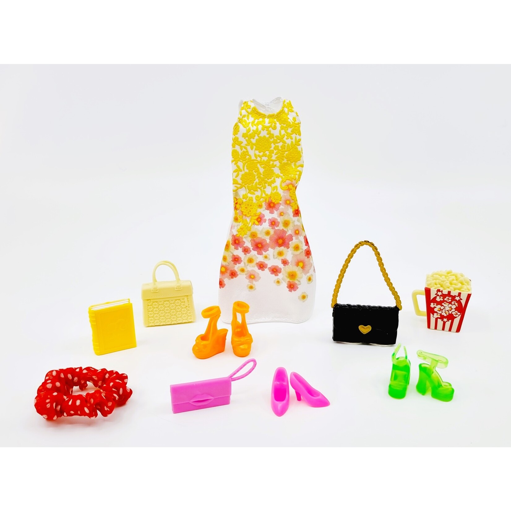 - Contient : 1 robe, 3 paires de chaussures, 3 sacs, 1 livre, 1 boîte à pop corn, 1 chouchou pour les cheveux