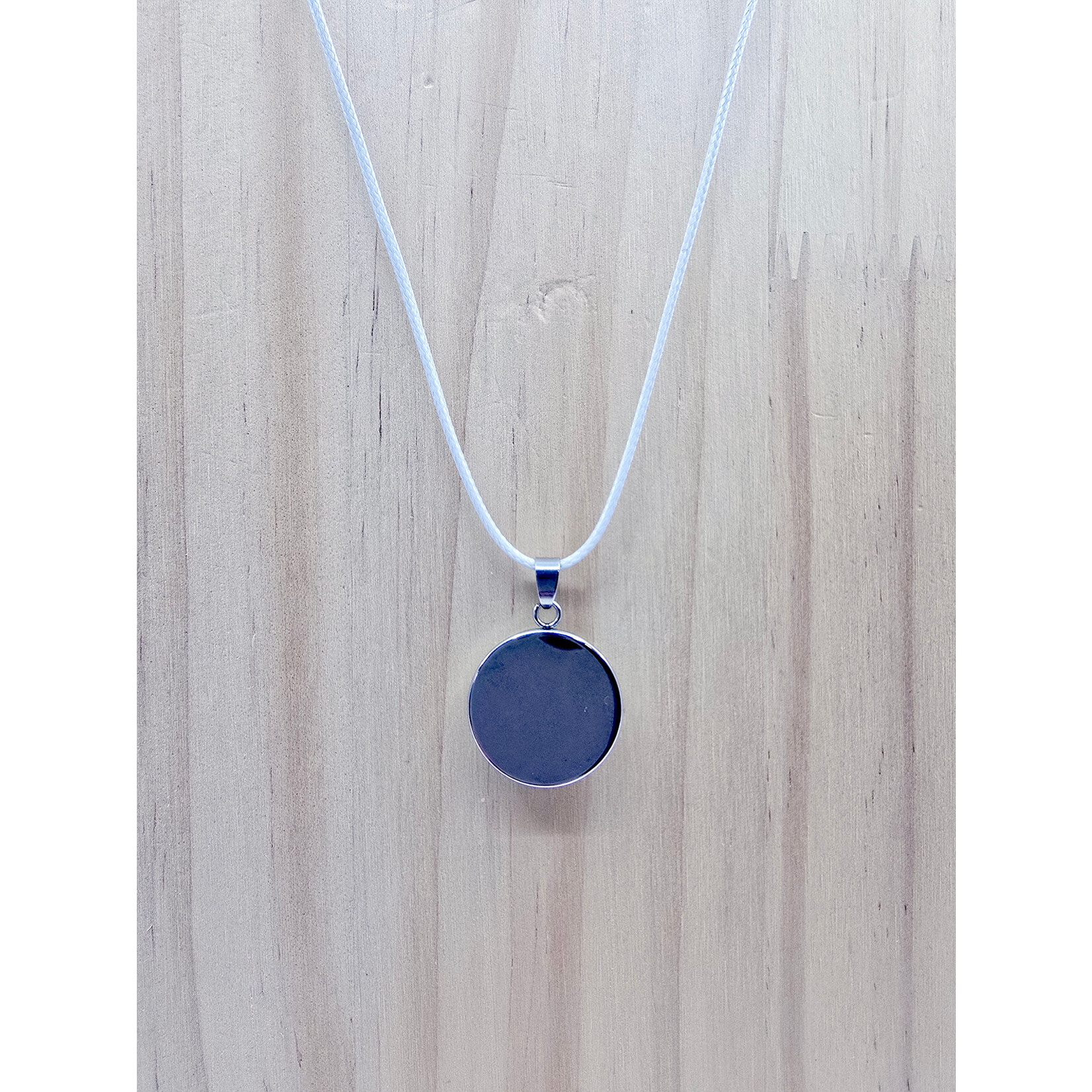 Matières : chaîne = cordon / support de pendentif = acier inoxydable / cabochon = verre.