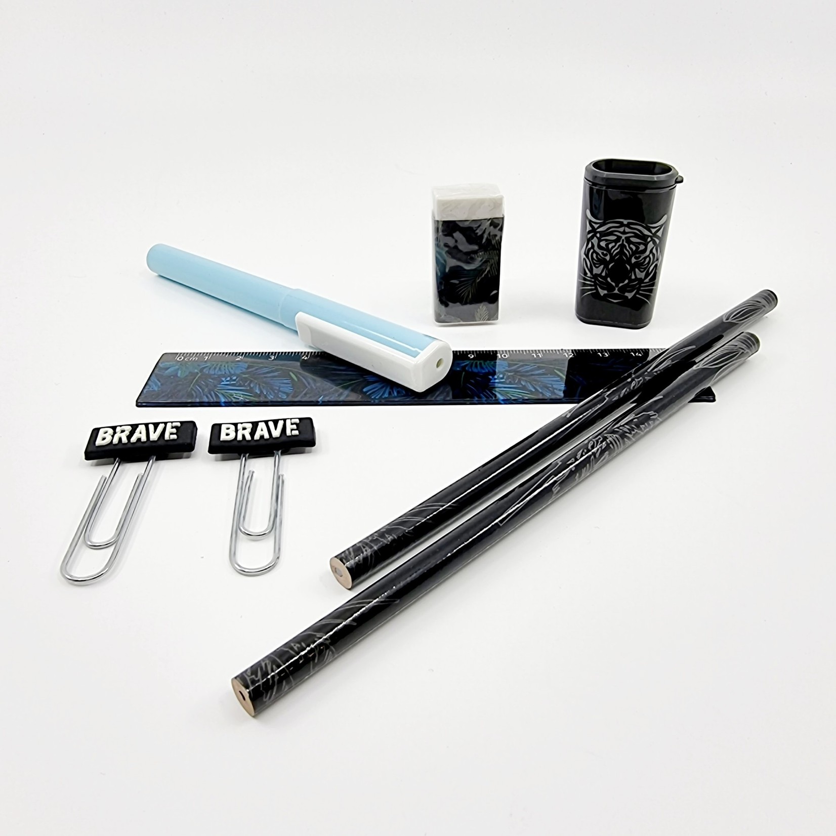 - Contient : 1 stylo bille, 2 crayons à papier, 1 gomme, 1 taille-crayon, 1 règle, 2 grands trombones