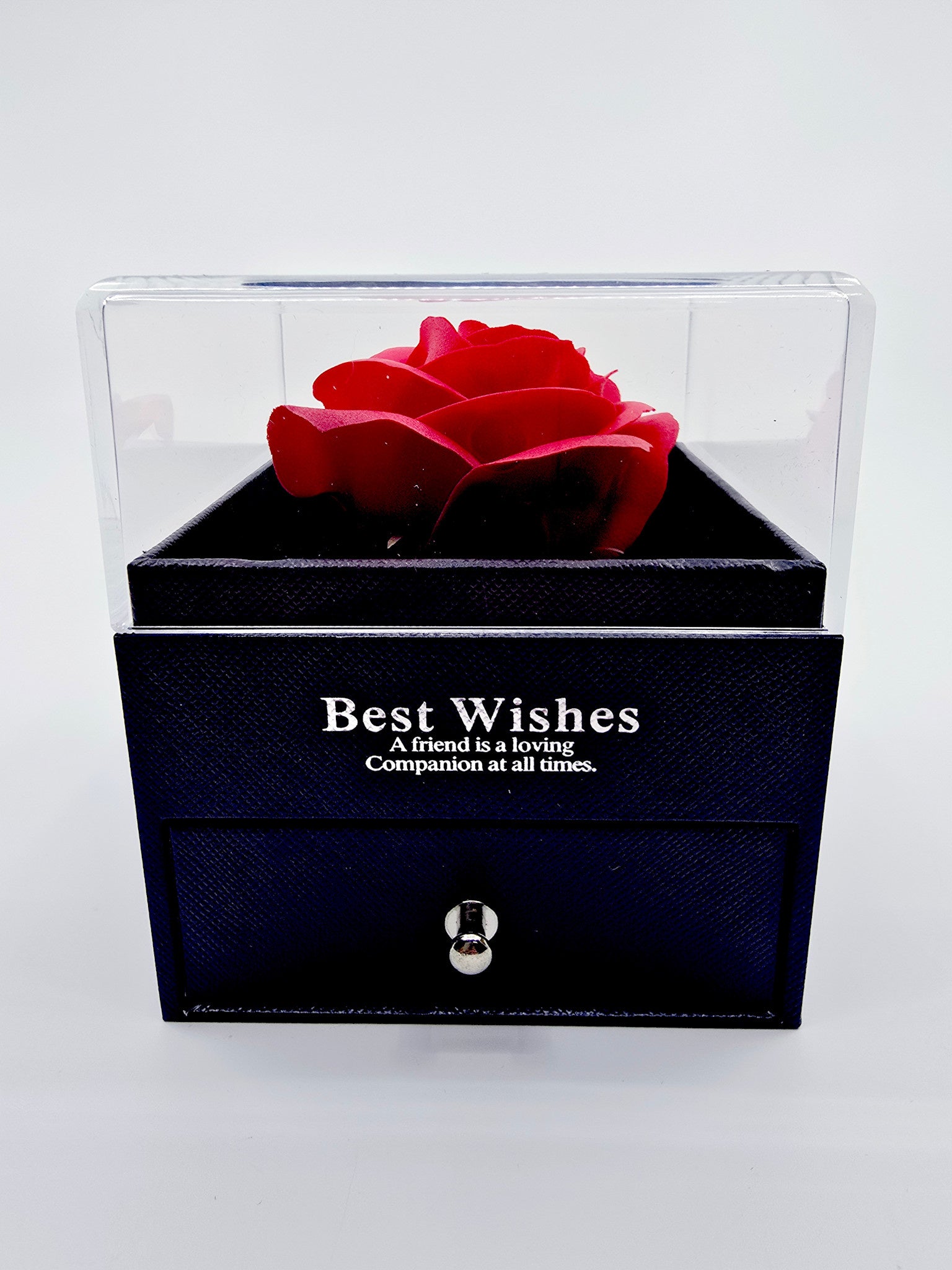 - Contient : 1 box avec tiroir, à l'intérieur 1 collier et, sur le dessus, 1 rose en acrylique