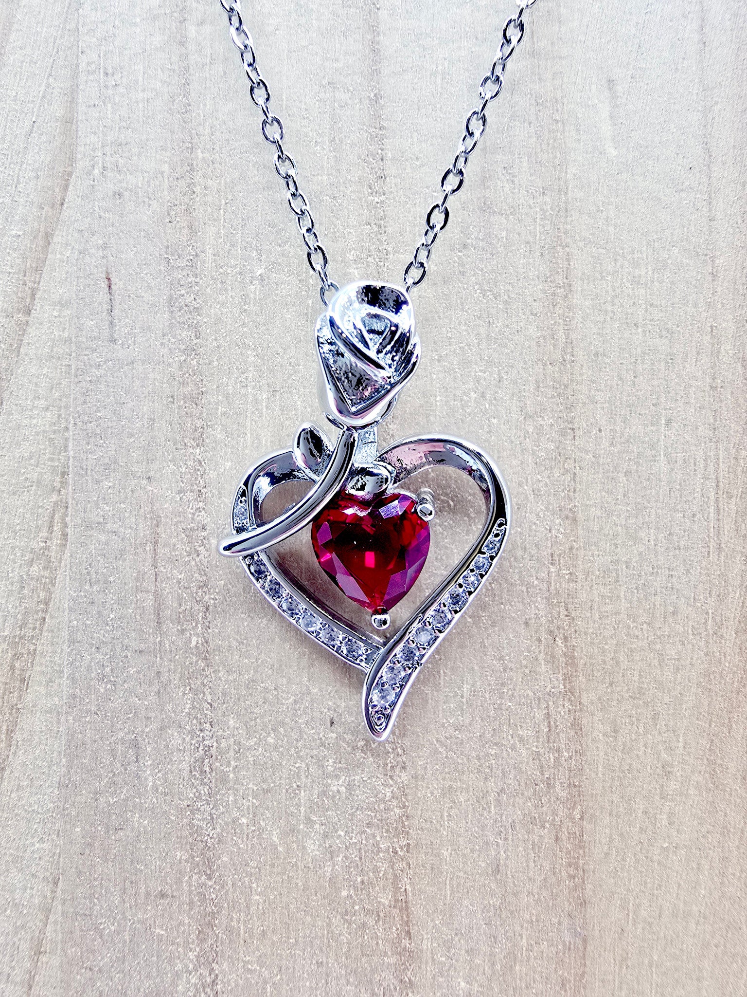 Matières : rose = acrylique / pendentif = alliage de zinc et zircon synthétique / chaîne = alliage de zinc.