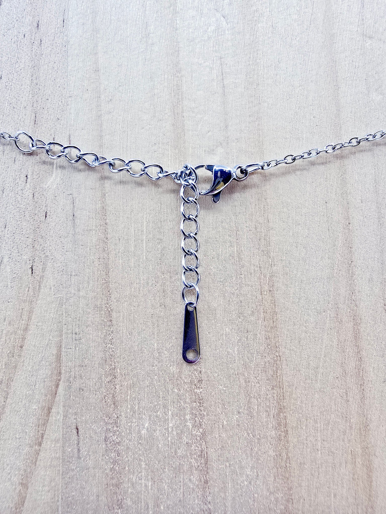 - Dimension = box : H : 10 cm - LO/LA : 9 cm / pendentif : LO : 3.2 cm - LA : 2 cm / chaîne : LO : 45-50 cm