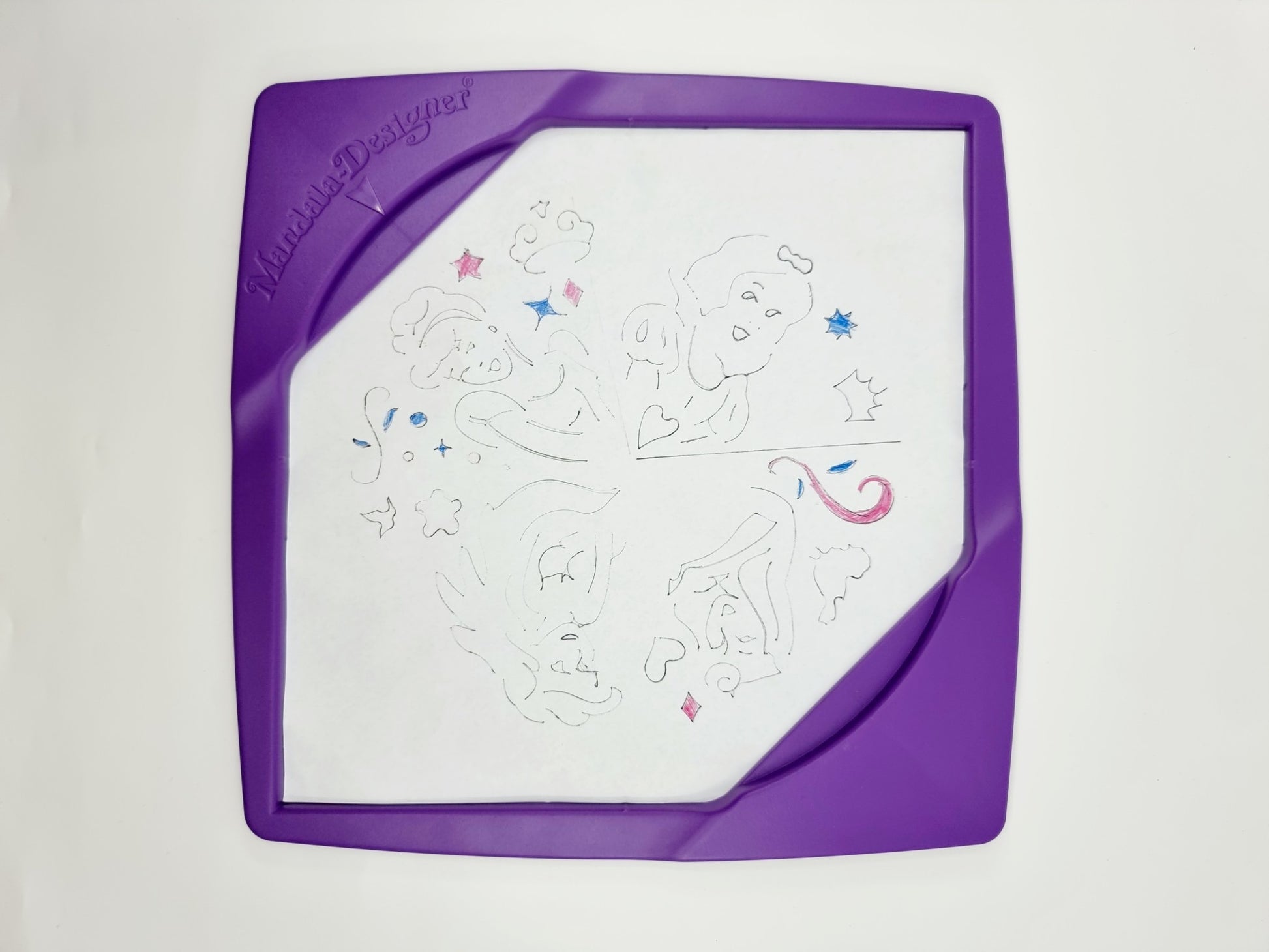 Crée tes propres mandalas ! Invente les plus beaux mandalas grâce au pochoir spécial. Place simplement une feuille de papier entre le cadre et le pochoir et c'est parti ! Tu peux répéter un motif aussi souvent que tu le souhaites, il suffit de tourner ton pochoir d'une flèche à chaque fois. Pour terminer ta création il ne te reste plus qu'à colorier.