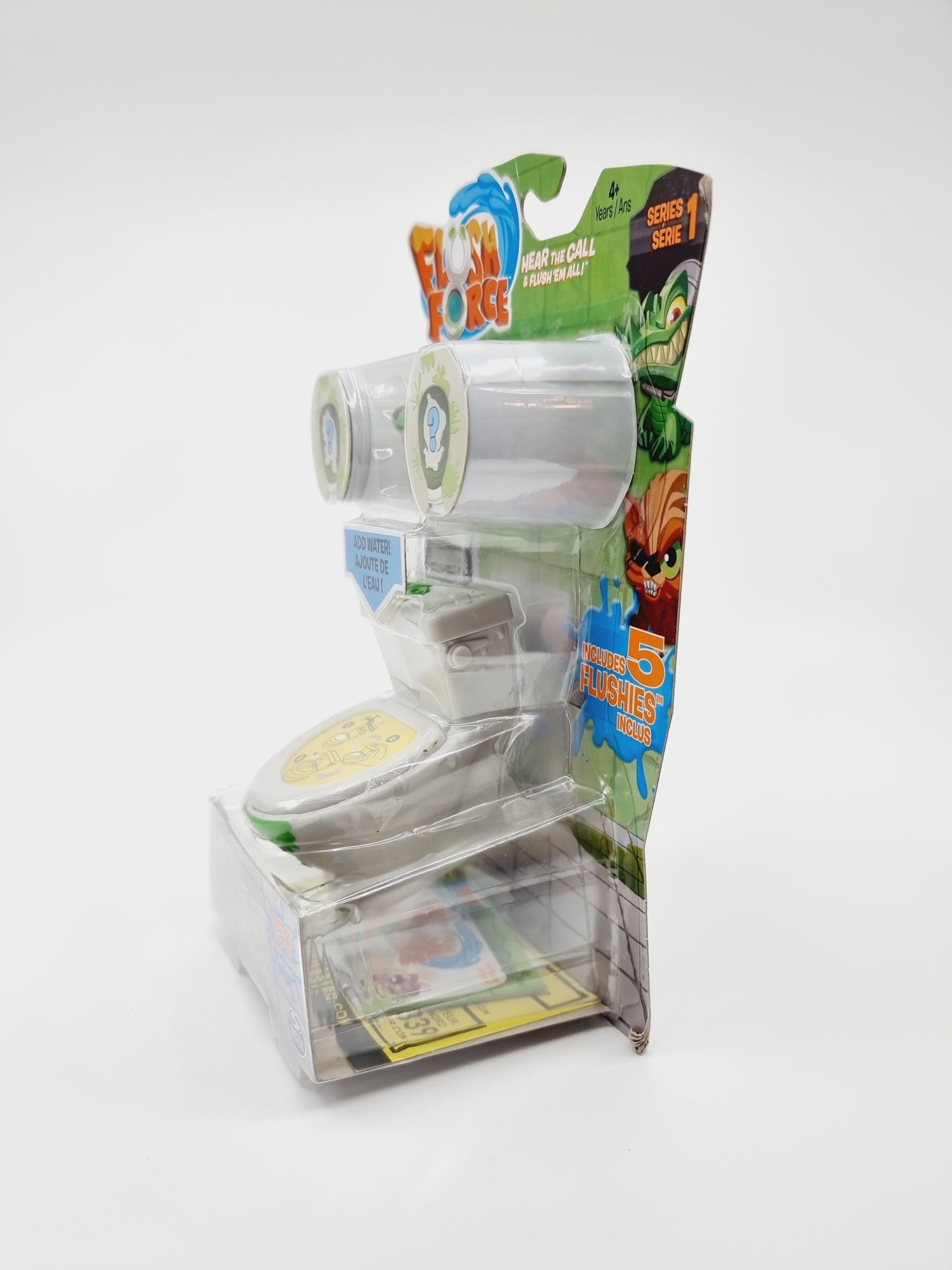 But du jeu : verse l'eau dans le réservoir, secoue la toilette, ouvre l'opercule de protection et découvre les Flushies cachés dans la cuvette. Lorsque l'eau entre en contact avec les Flushies, elle change de couleur et devient verdâtre de saleté, pour un amusement garanti. 150 figurines à collectionner.