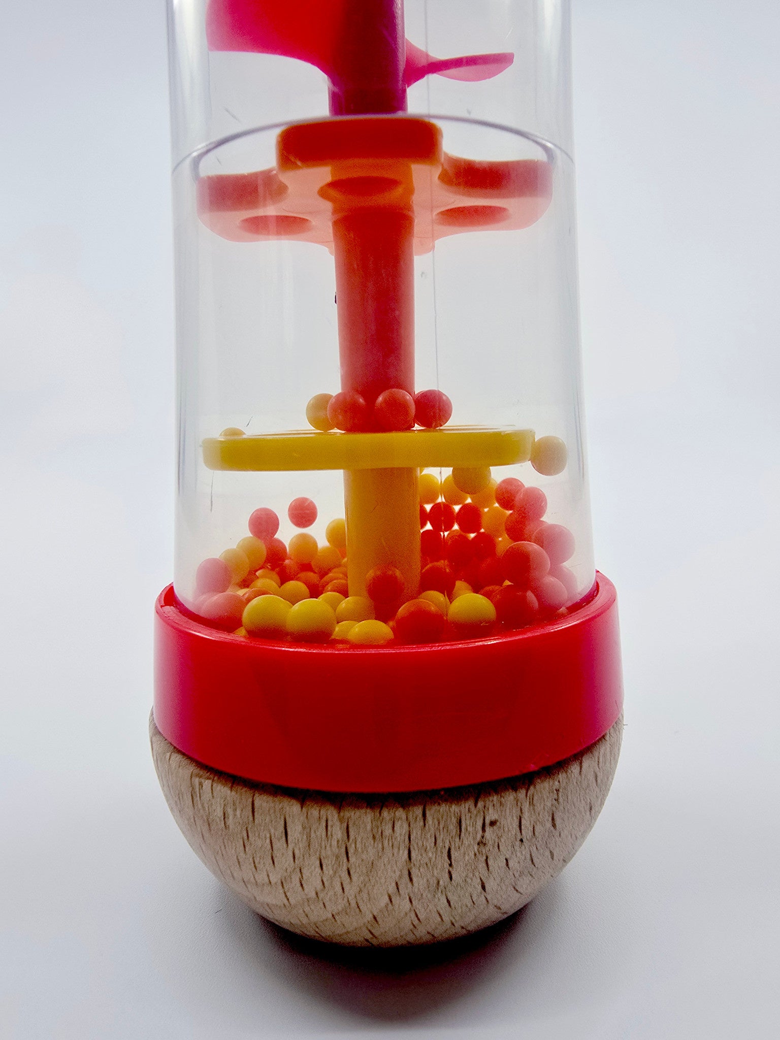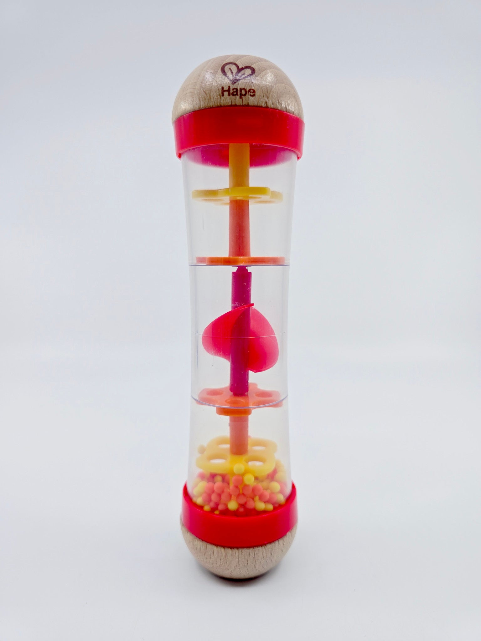 Lorsqu'on le retourne, les petites billes à l'intérieur tombent doucement à travers la structure en produisant un son de pluie apaisant, idéal pour calmer bébé ou accompagner un moment de détente. Sa forme ergonomique est facile à saisir pour les petites mains, permettant à l'enfant de secouer, retourner et observer le mouvement des billes en toute autonomie.