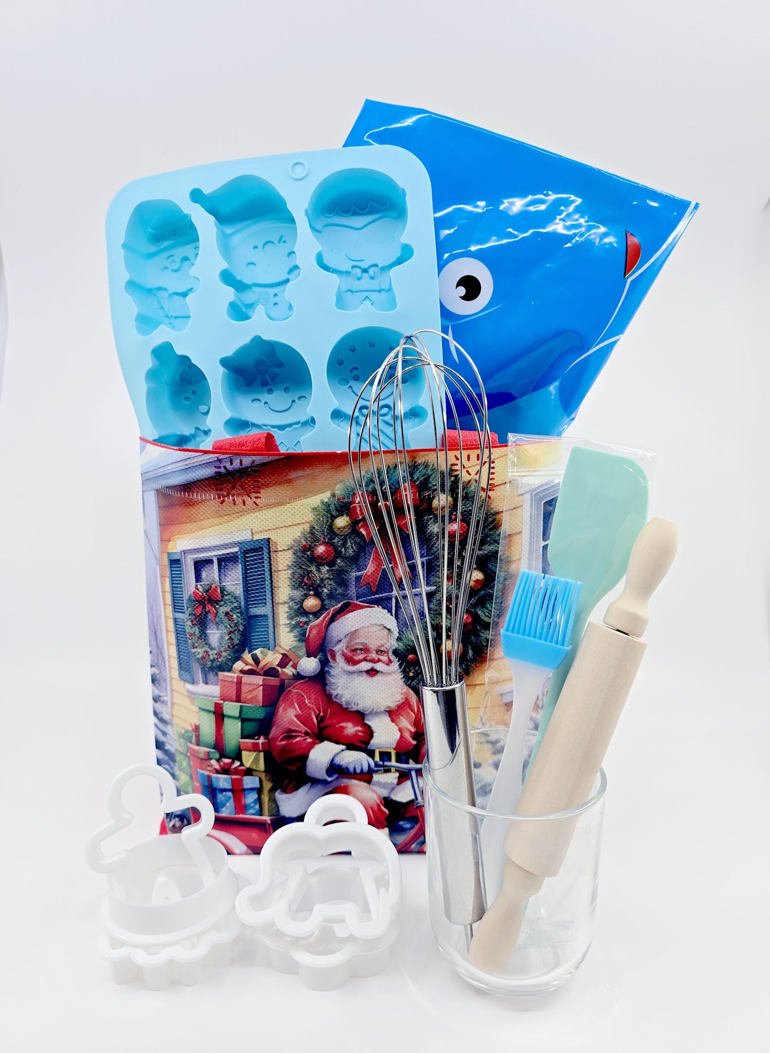 - Contient : 1 tablier, 1 rouleau à pâtisserie, 1 fouet, 1 spatule, 1 pinceau, 1 moule en silicone, 6 emporte-pièces