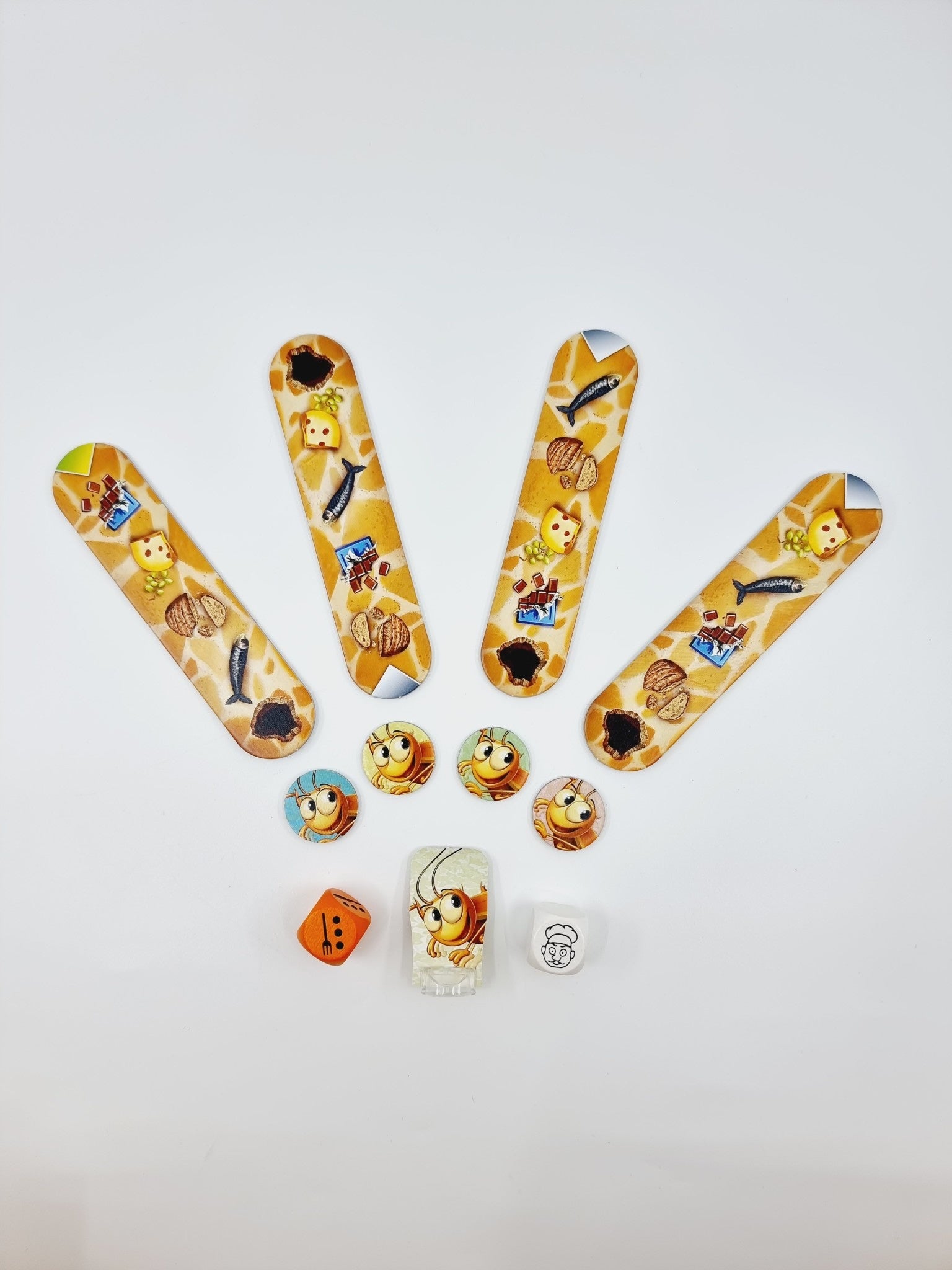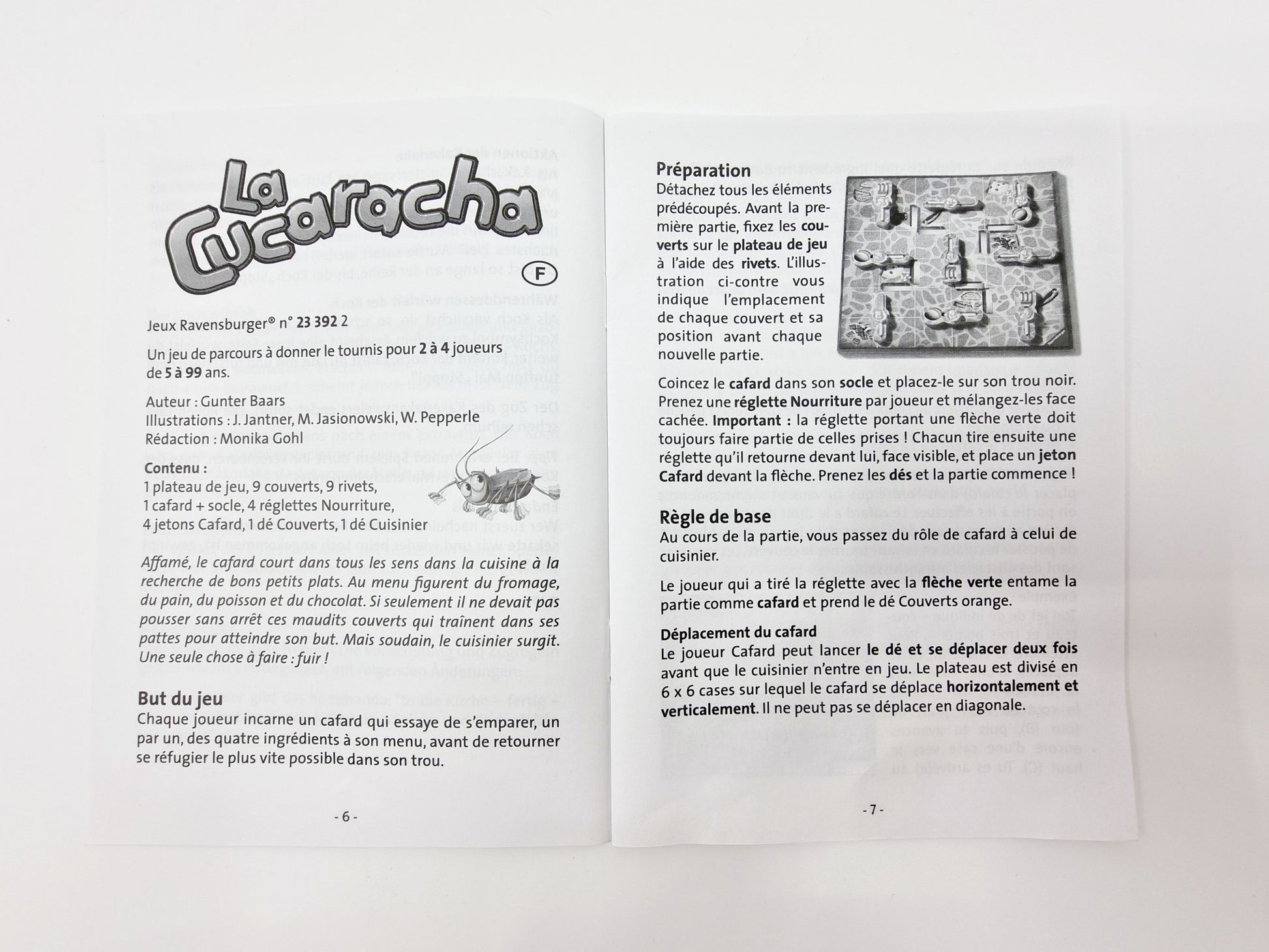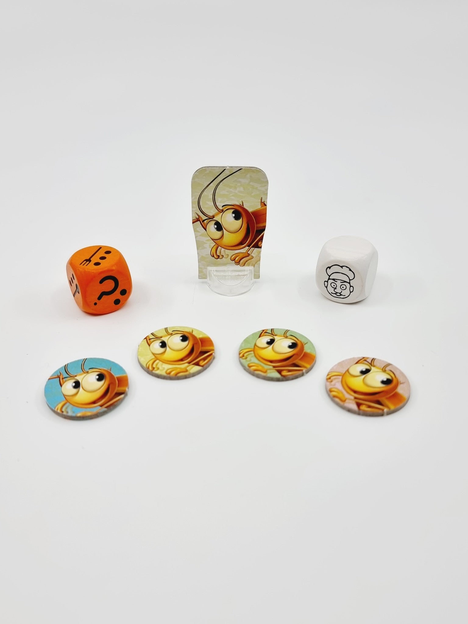 - Contient : 1 plateau, 9 couverts, 9 rivets, 1 cafard avec socle, 4 réglettes nourriture, 4 jetons cafard, 2 dés couverts + cuisinier, règles du jeu