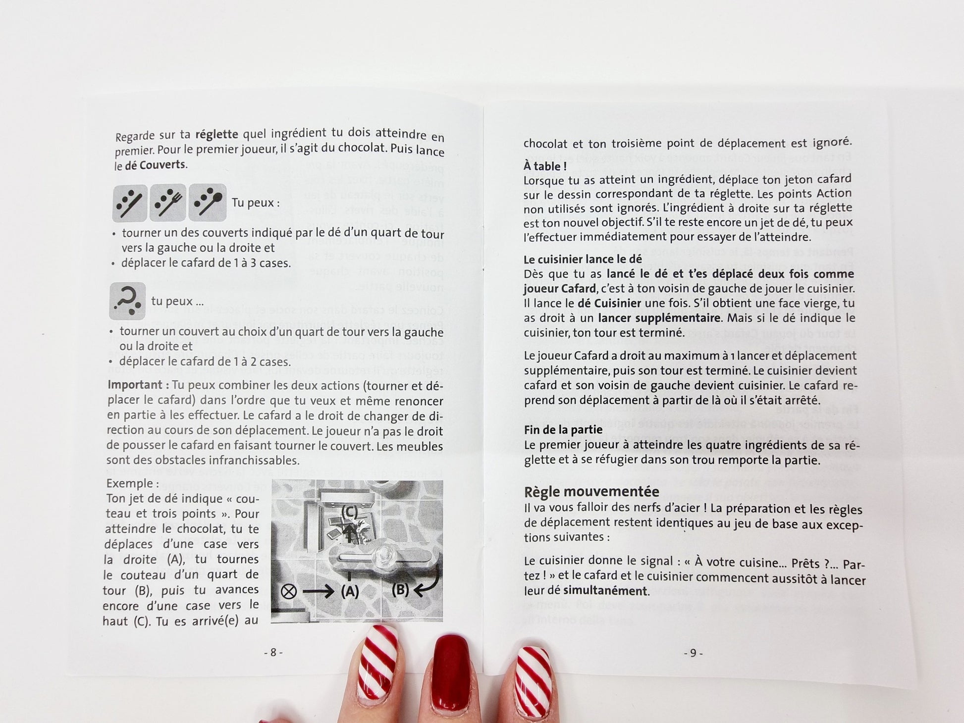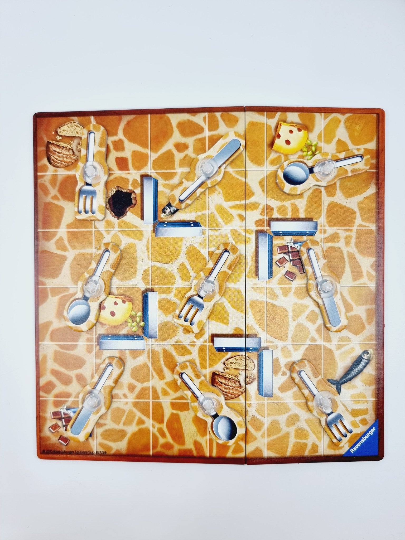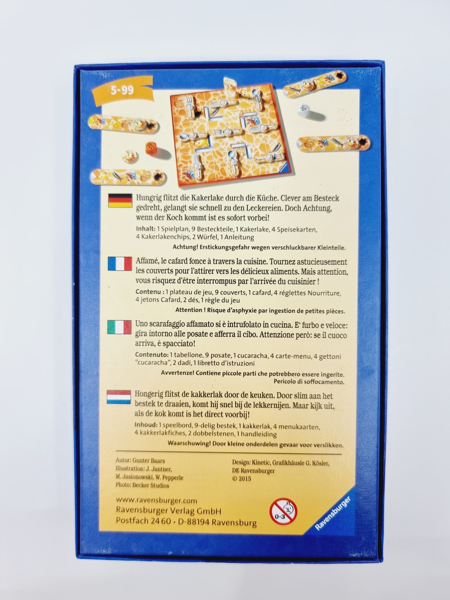 - Contient : 1 plateau, 9 couverts, 9 rivets, 1 cafard avec socle, 4 réglettes nourriture, 4 jetons cafard, 2 dés couverts + cuisinier, règles du jeu