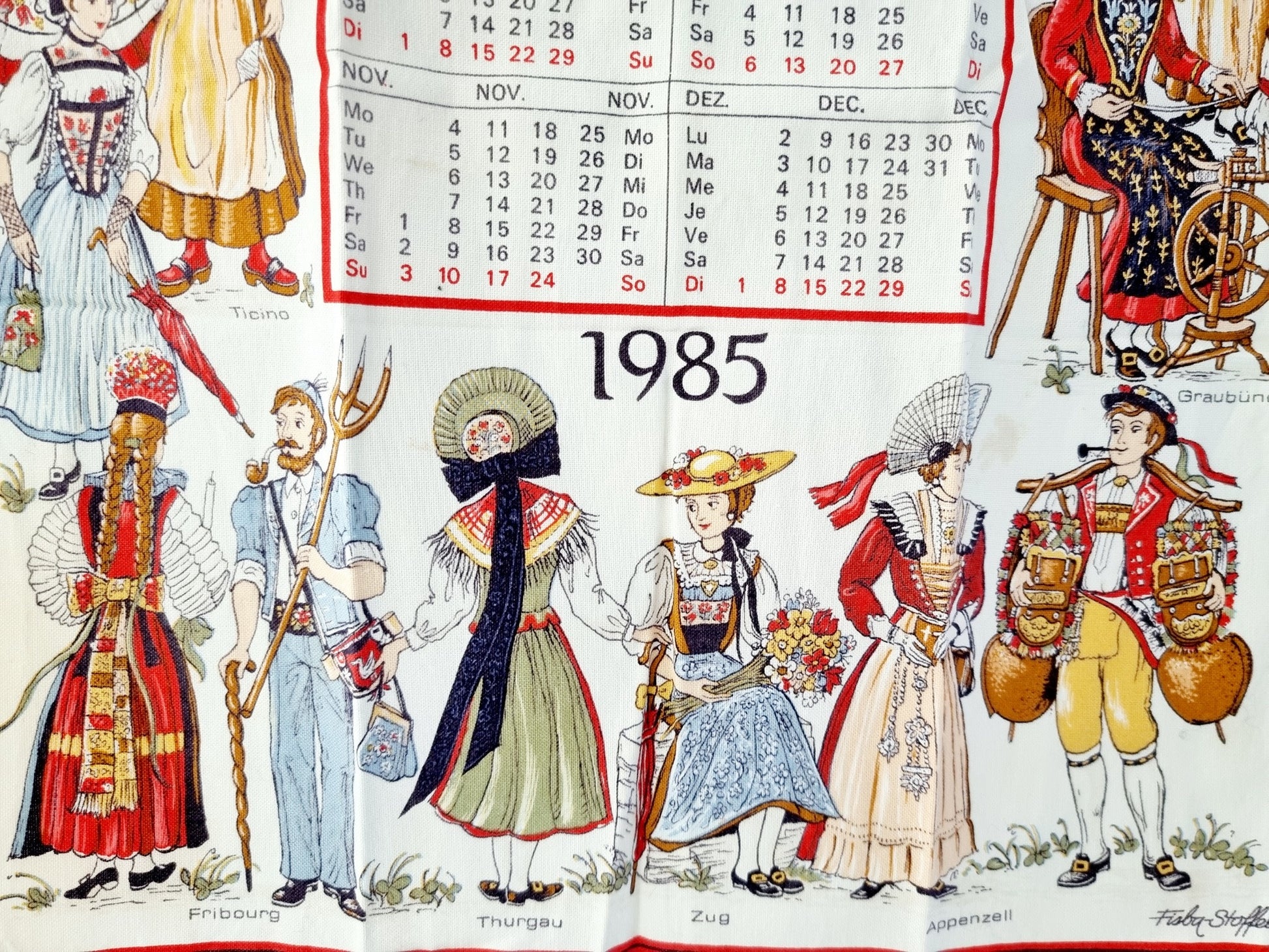 Linge de cuisine - calendrier 1985 costumes suisses traditionnels (70 X 40 cm)