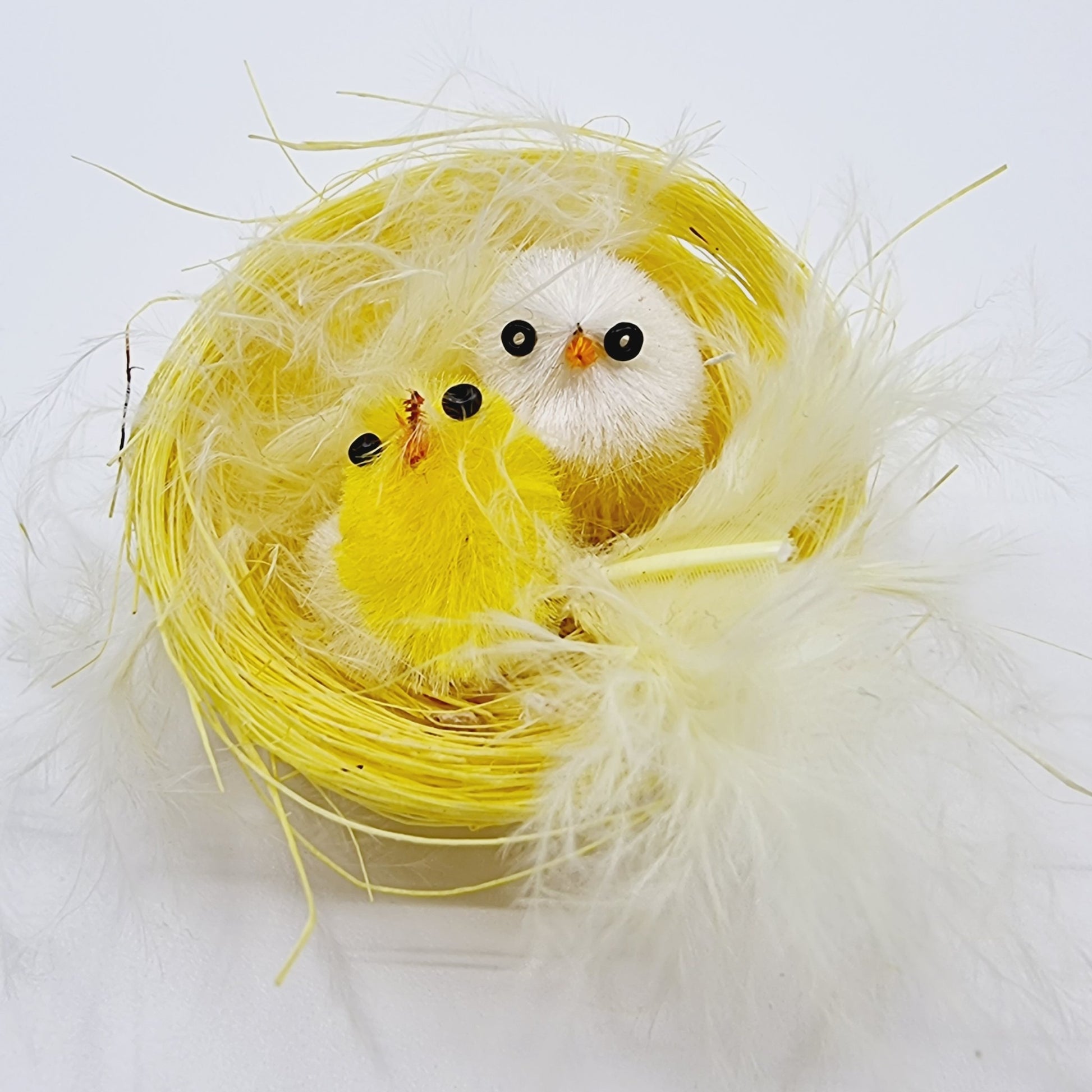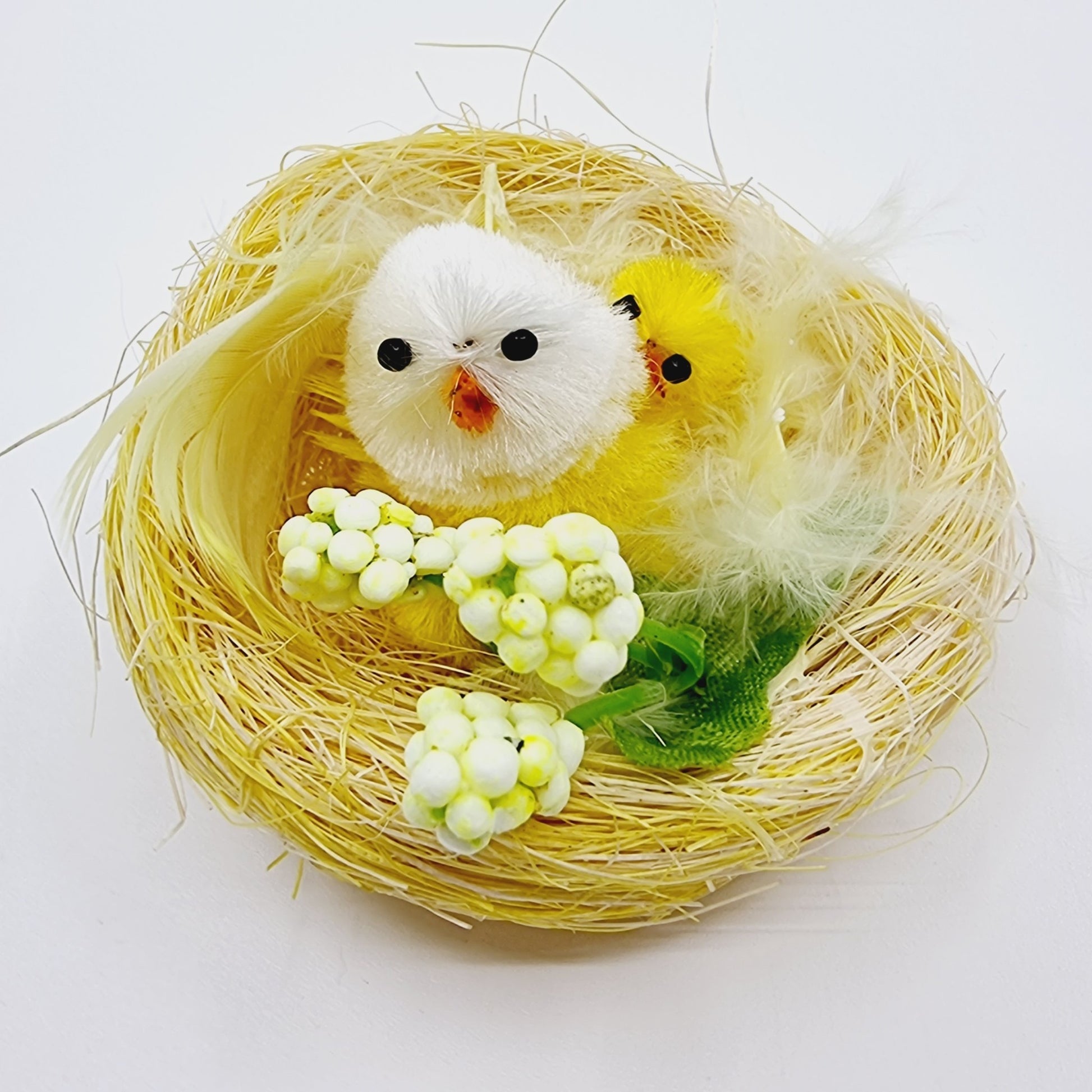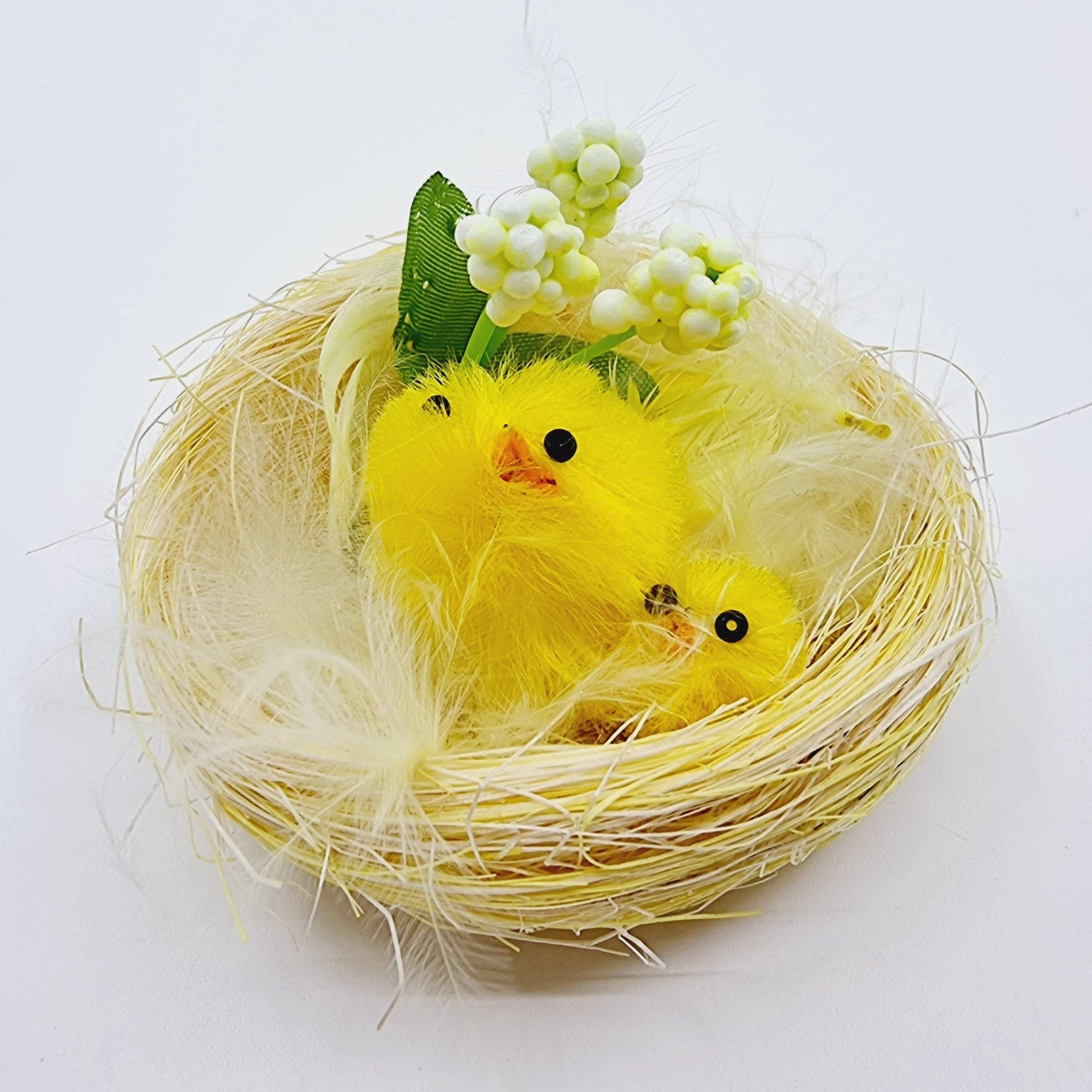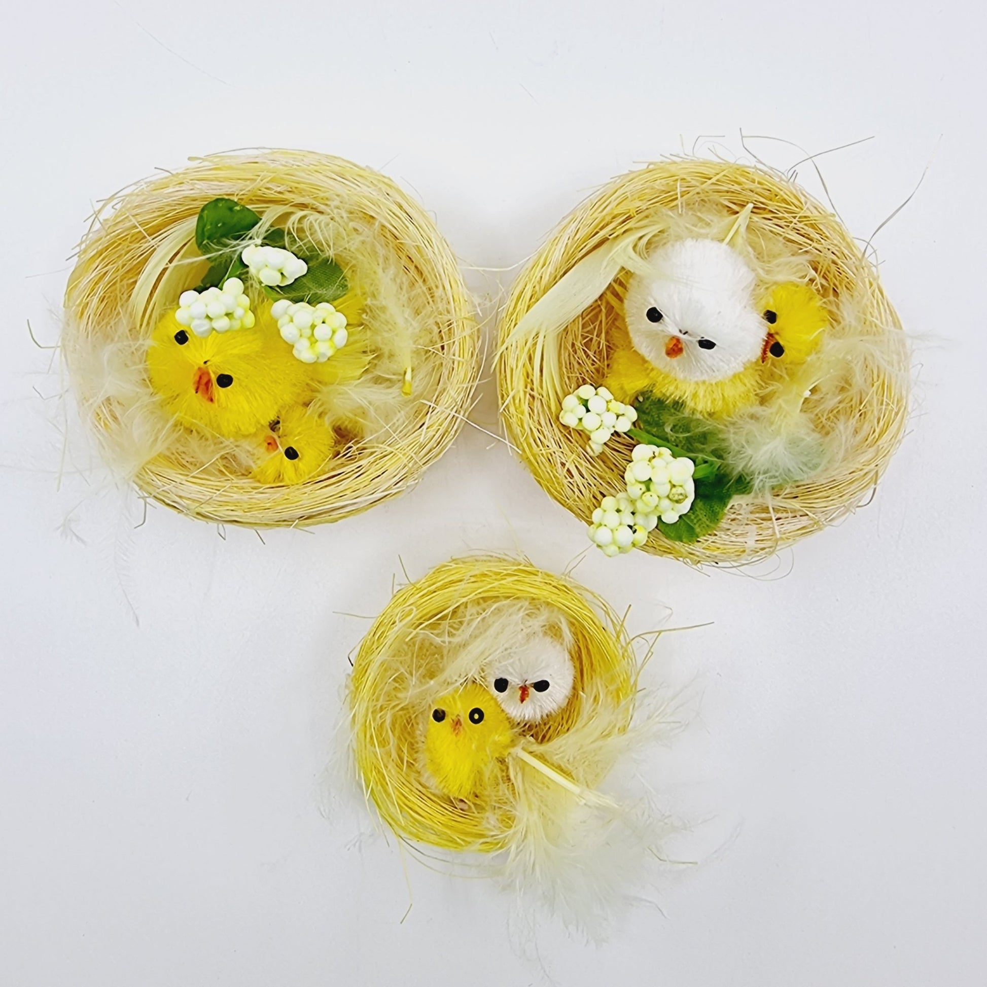 - Contient : 2 nids de Ø : 6 cm avec 2 poussins, 1 plante et des plumes + 1 nid de Ø : 6 cm avec 2 poussins et plumes