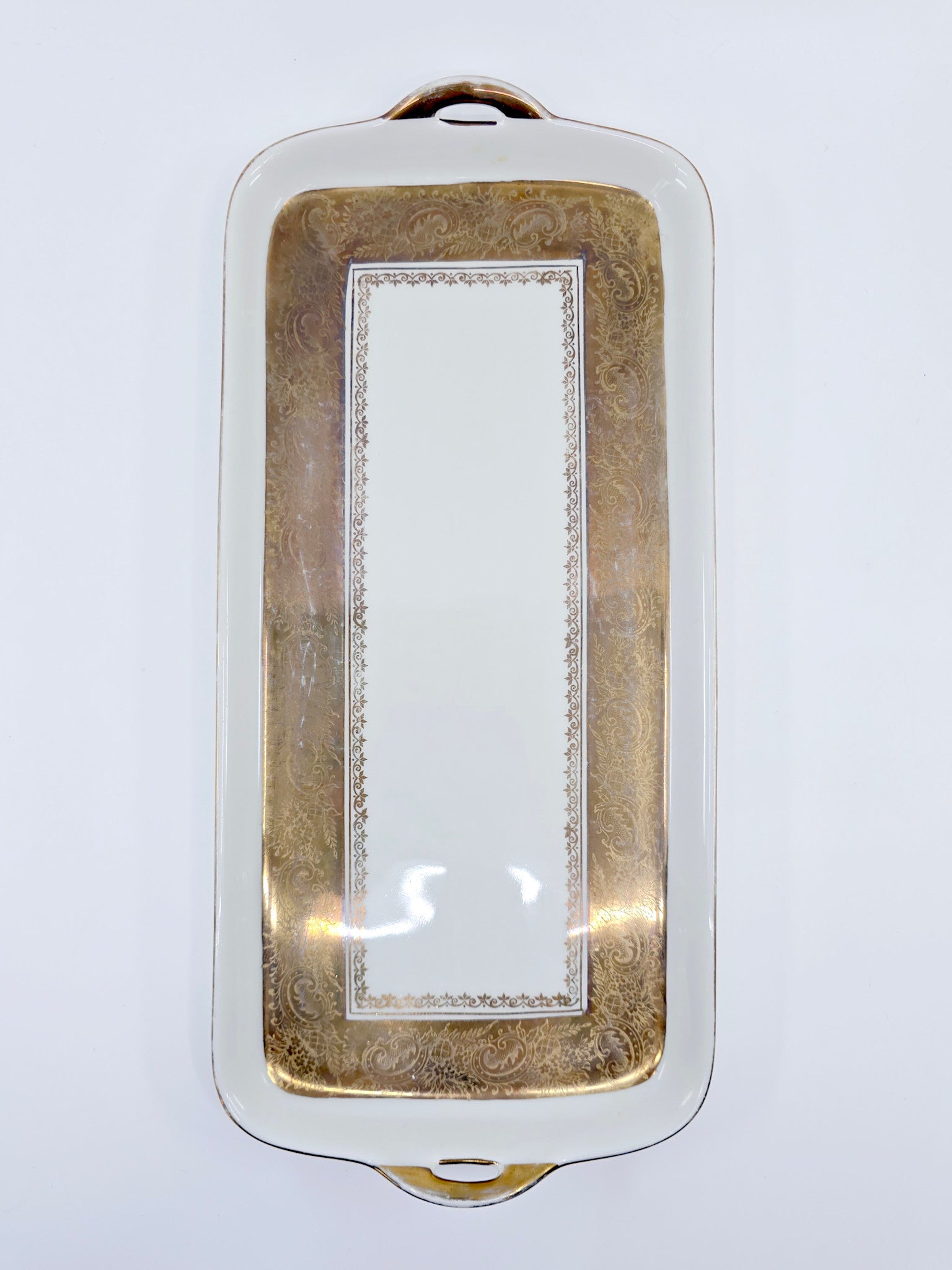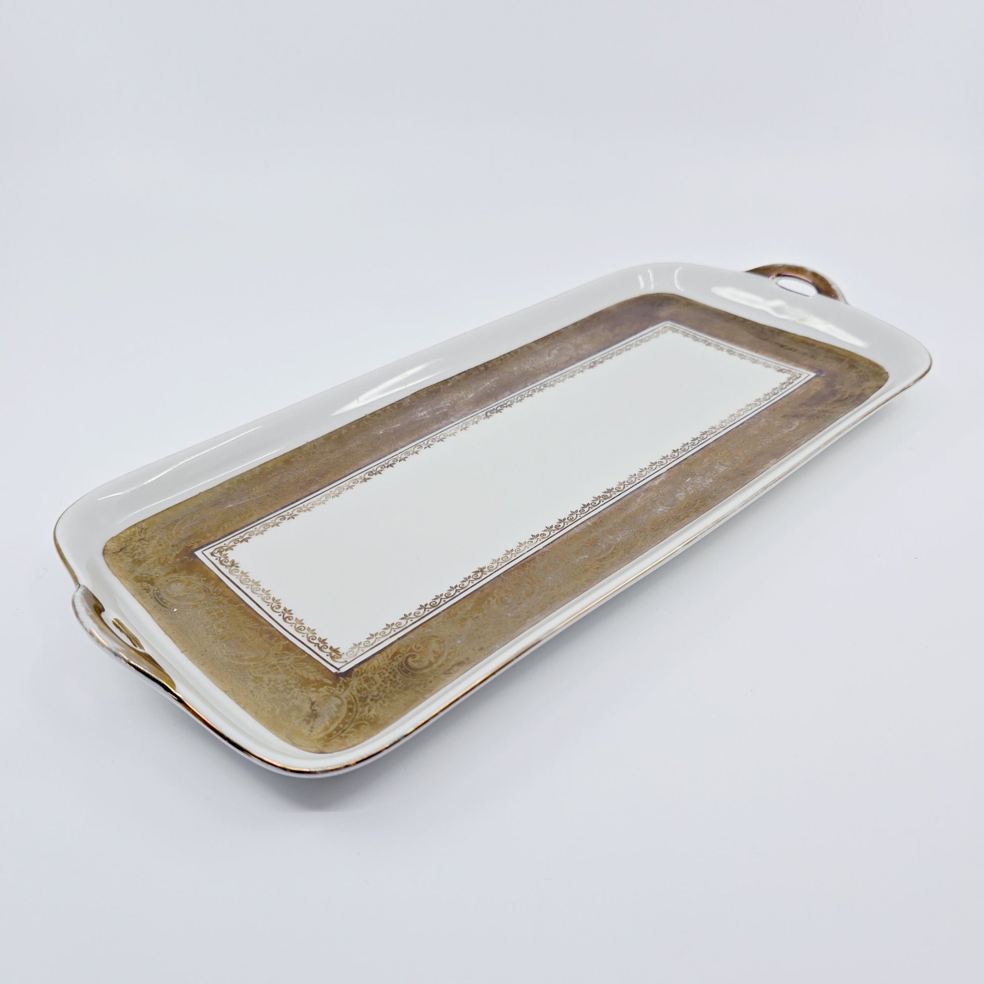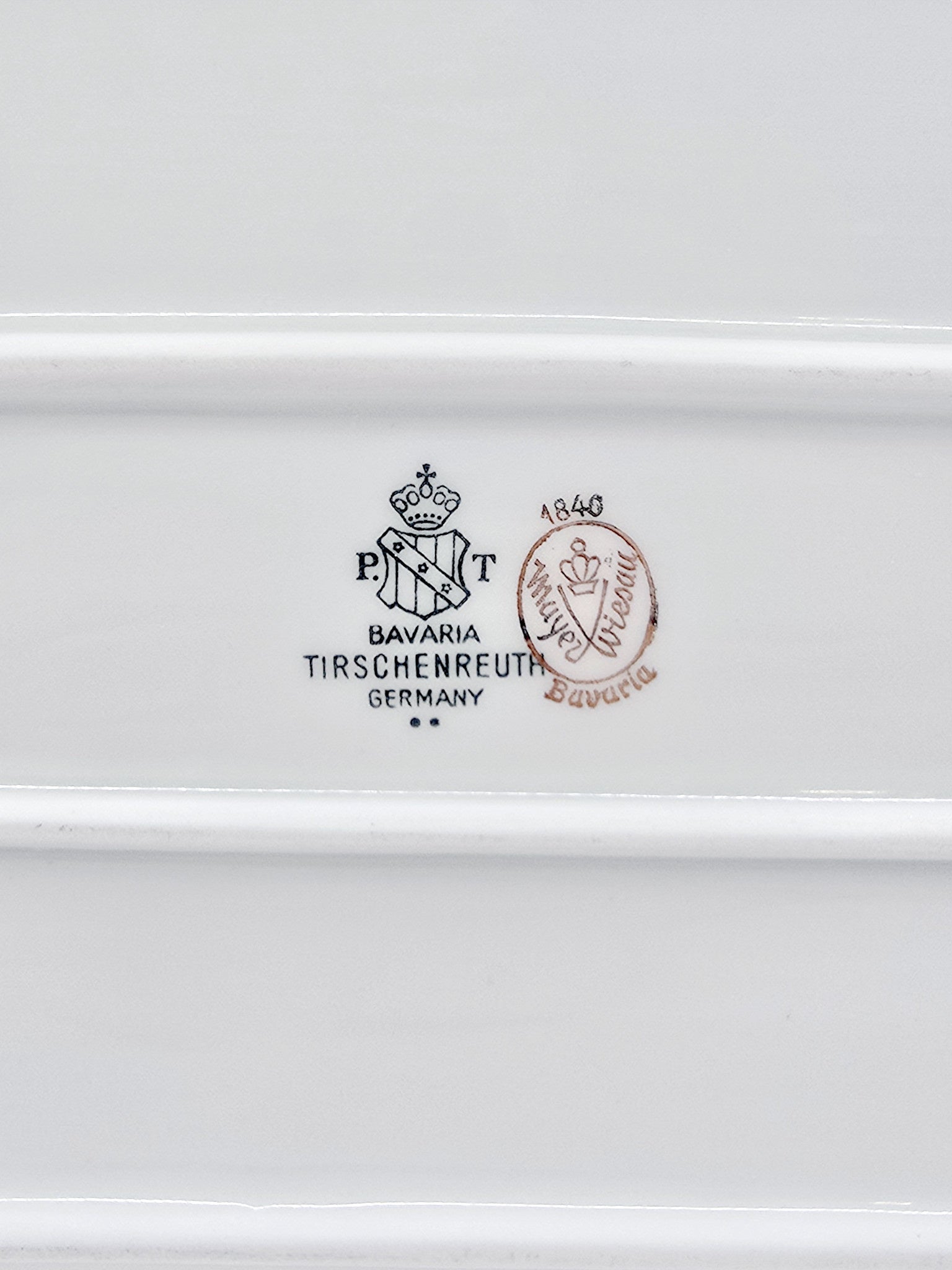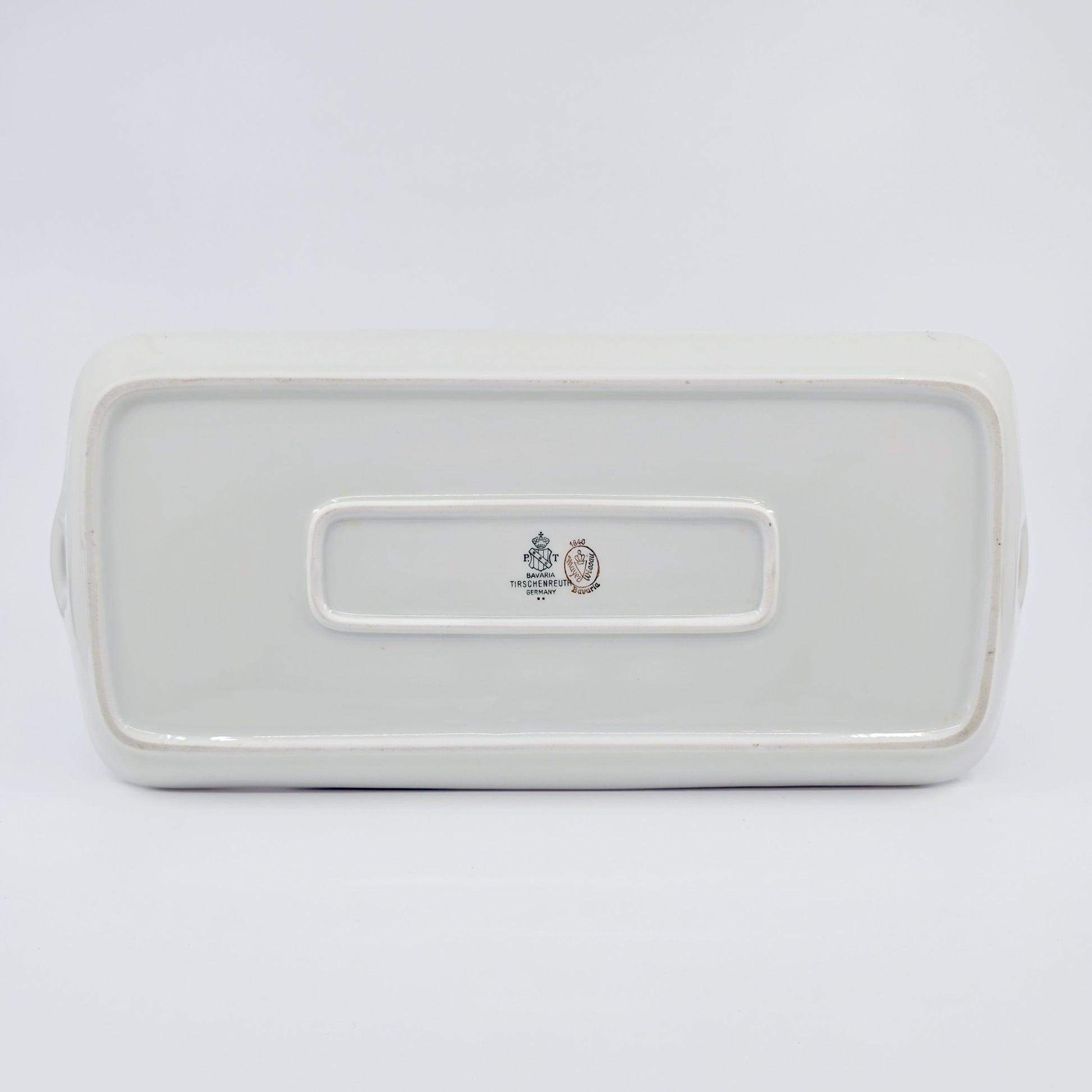 Plat à gâteau ancien en porcelaine allemande, fabriqué en Bavière à Tirschenreuth. Sa forme allongée avec poignées latérales est typique des plats à gâteaux utilisés pour le service des pâtisseries et gâteaux maison au milieu du XXᵉ siècle.