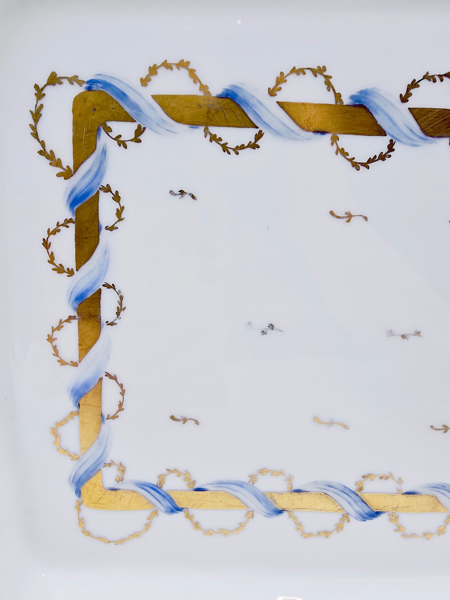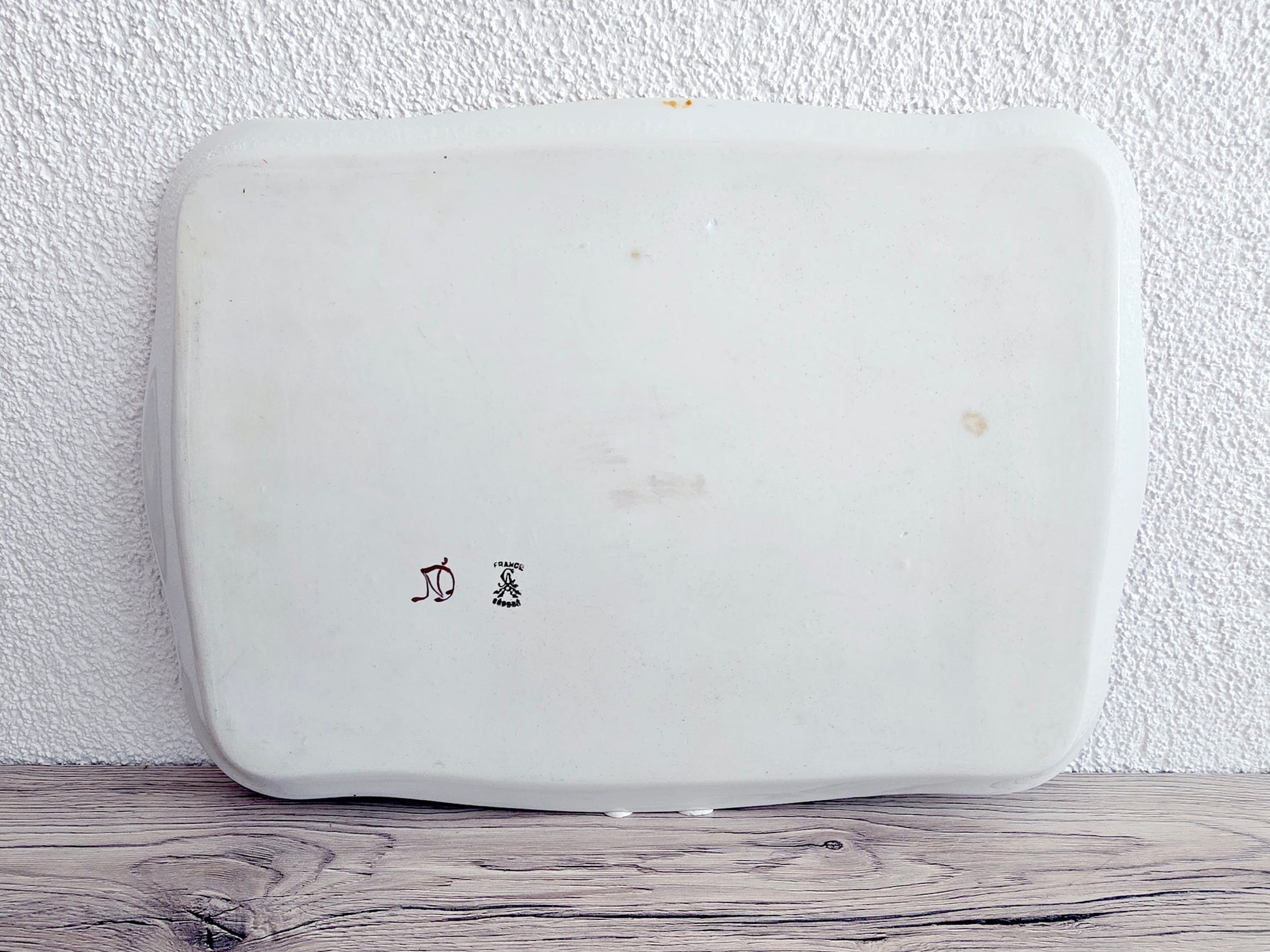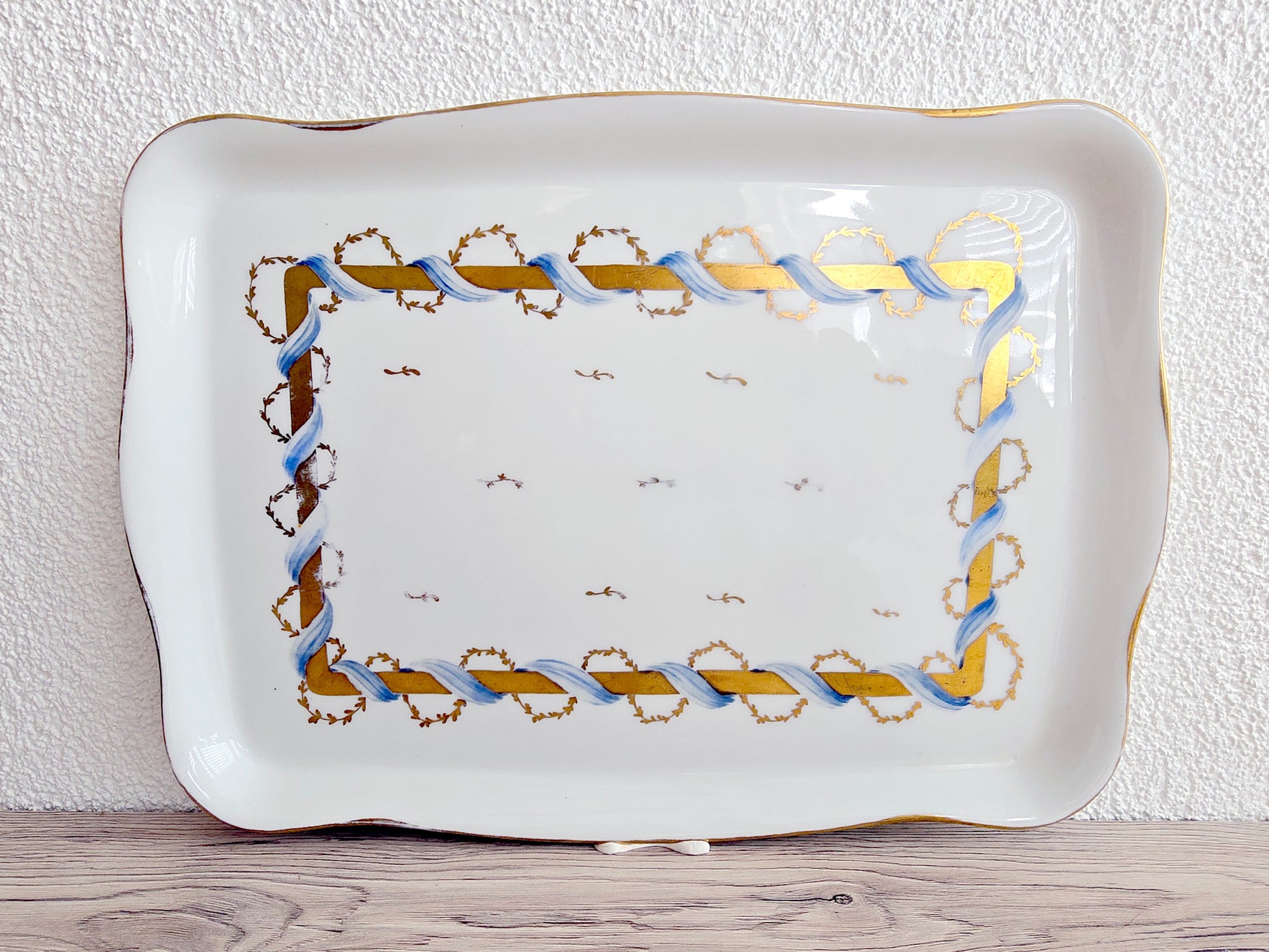 Plat de service rectangulaire ancien en porcelaine française, de forme généreuse avec bords légèrement ondulés. Son décor raffiné associe une frise dorée à des rubans bleus et des motifs végétaux stylisés, encadrant une réserve centrale claire. Cet ornement évoque l’esthétique classique des arts de la table française du milieu du XXᵉ siècle.