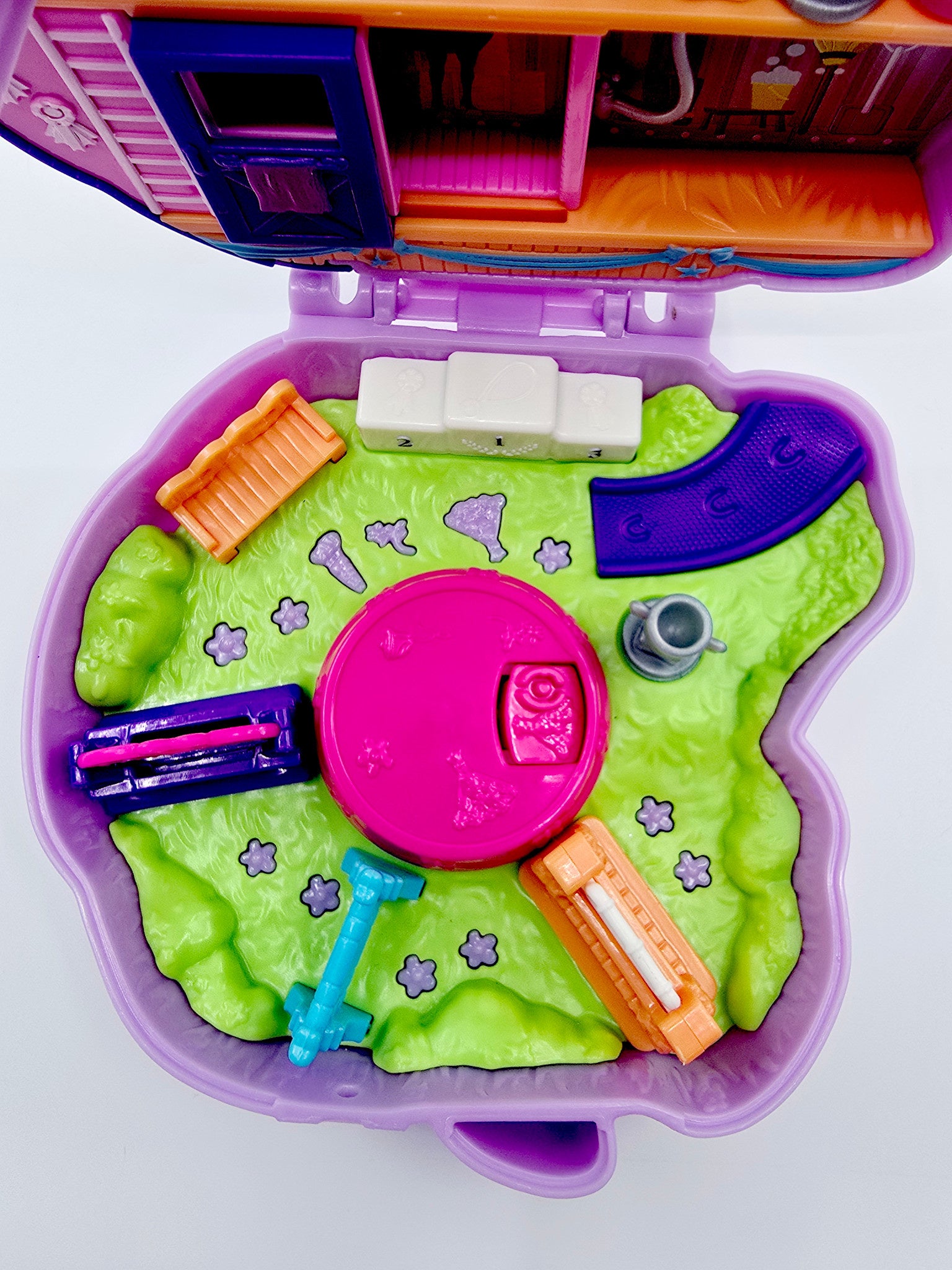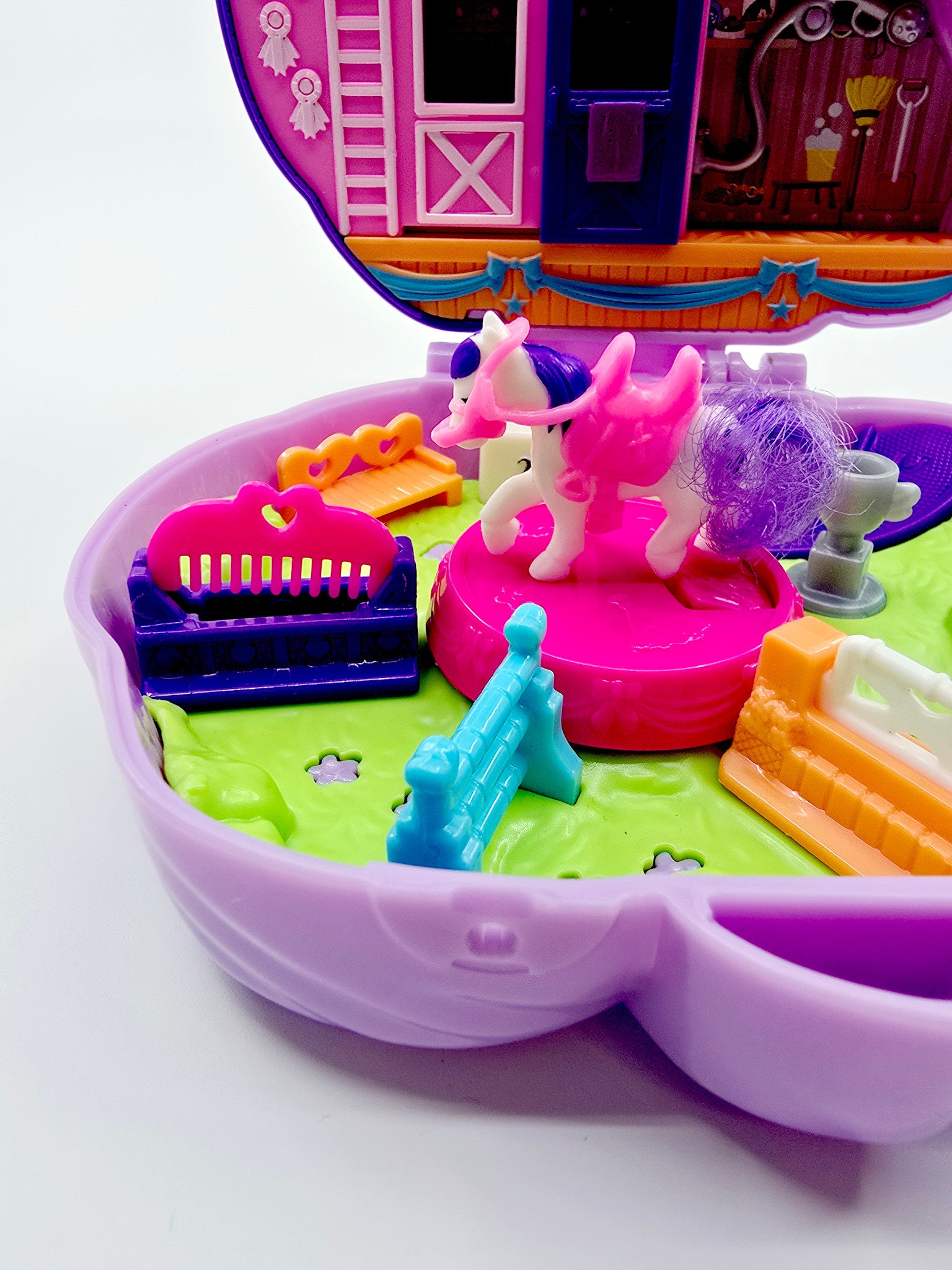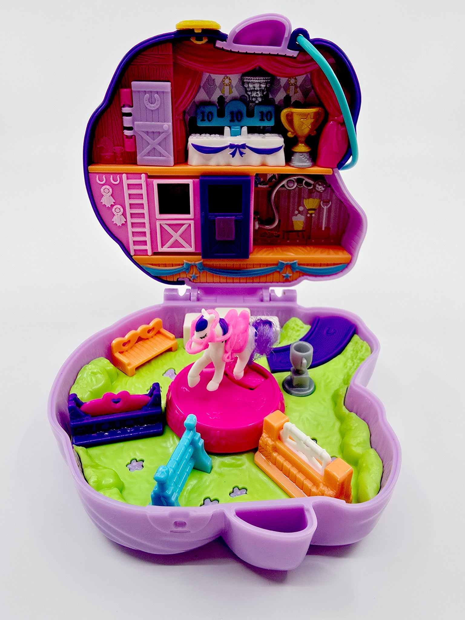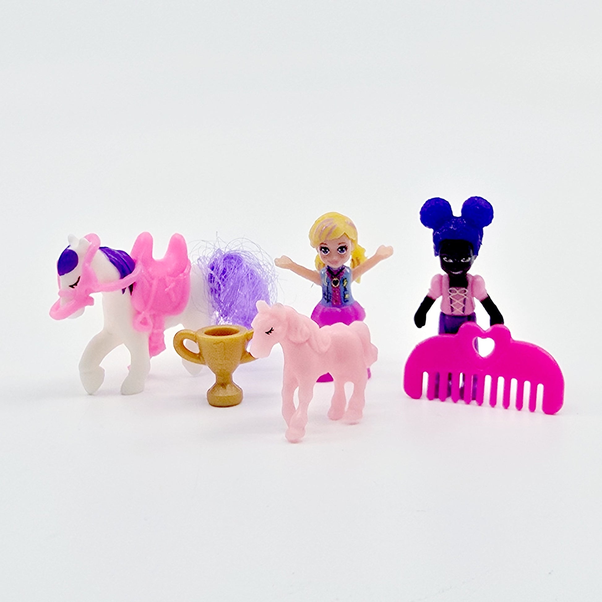 - Contient : 1 coffret en forme de cheval, 2 figurines Polly Pocket, 1 cheval avec selle, 1 poulain, 1 trophée, 1 peigne
