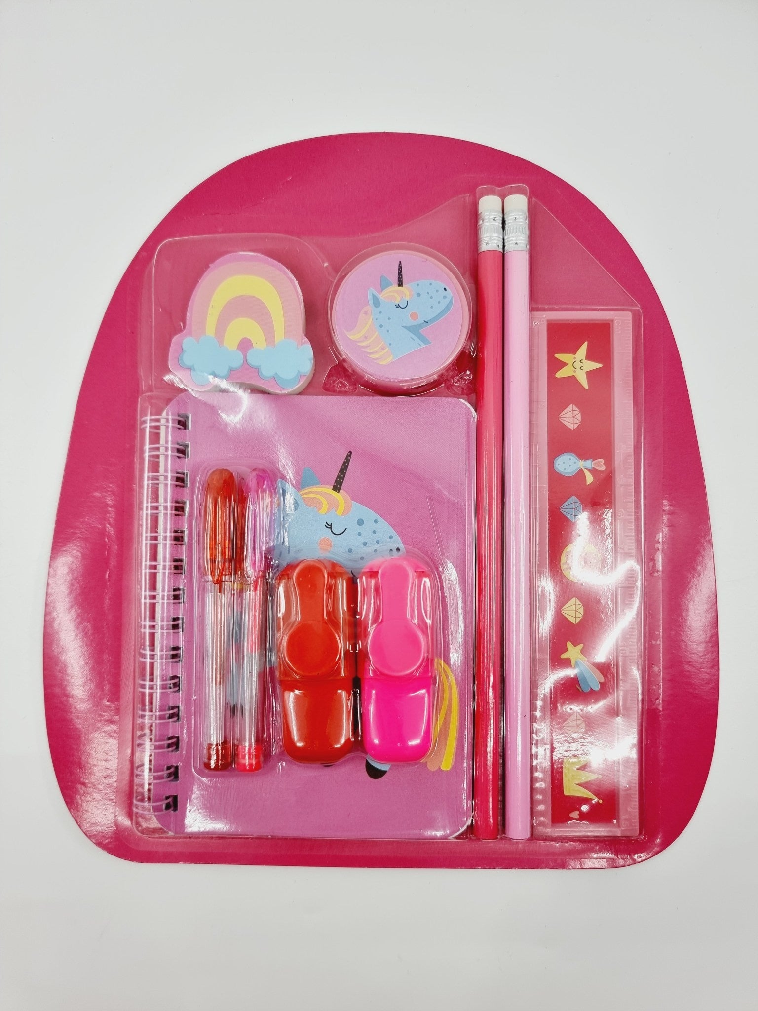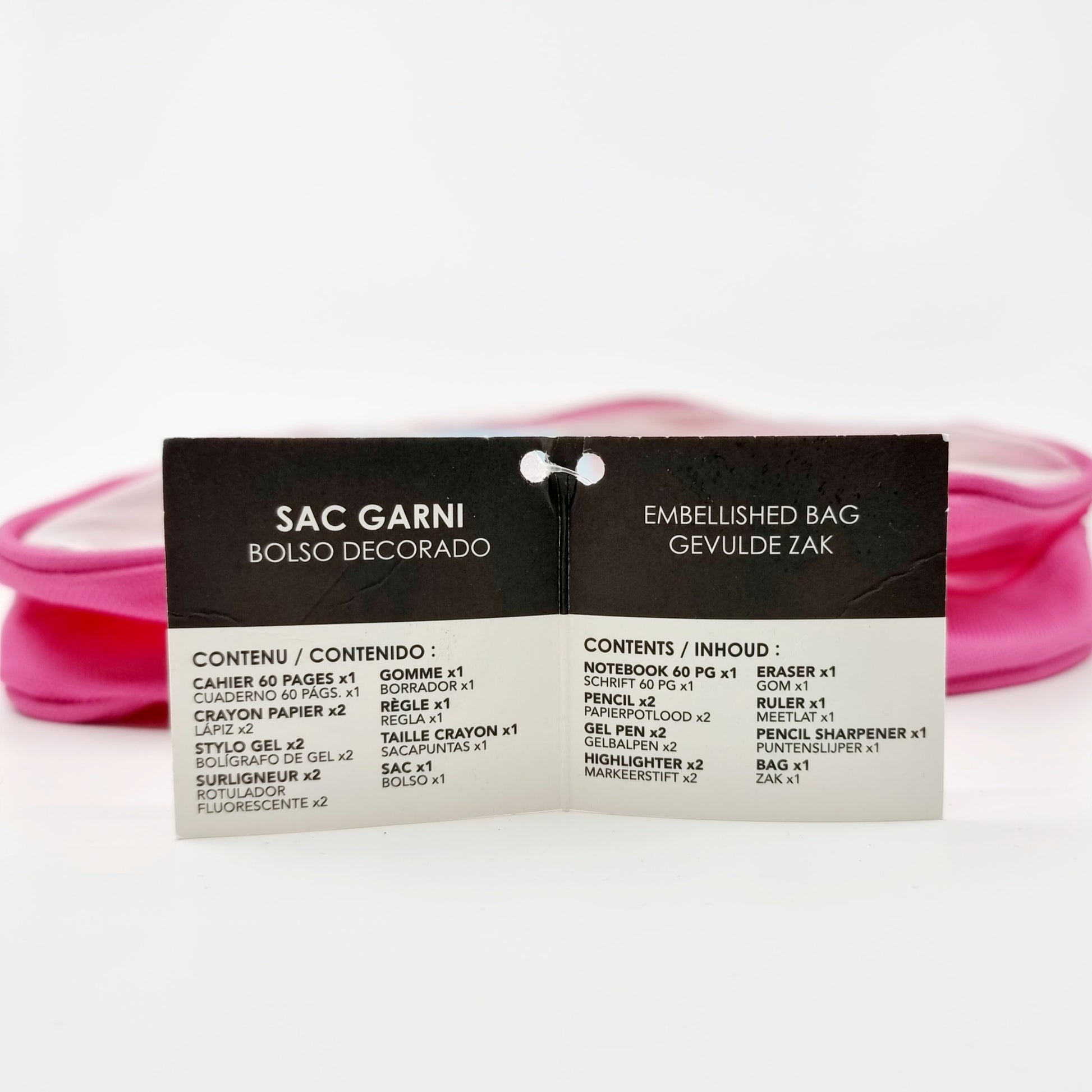 - Le sac contient : 1x cahier de 60 pages, 2x crayons de papier, 2x stylos gel, 2x surligneurs, 1x gomme, 1x règle, 1x taille-crayon, 1x sac à dos