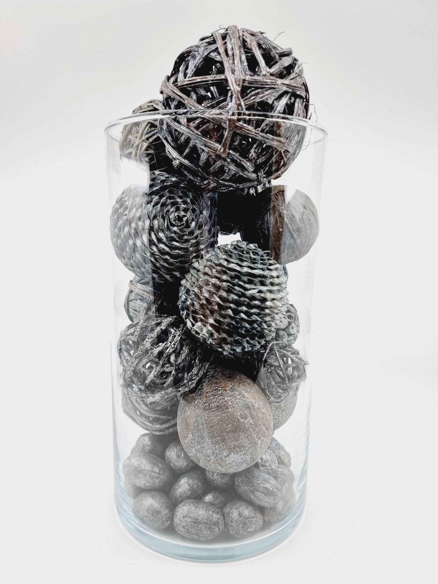 - Contient : 1 vase cylindrique en verre, 48 boules décoratives de taille et de forme différentes